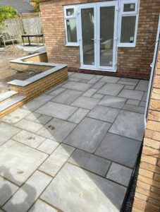 We have years of experience designing and laying patios for our customers. We can lay all types of patios including natural stone, Indian stone, concrete pavings, porcelain tiles, edgings and brick on edge. We can also lay driveways, artificial turf and rockeries.